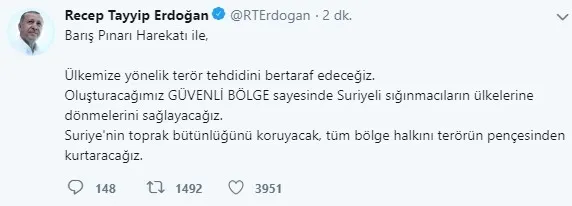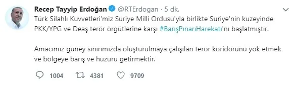“Türk Silahlı Kuvvetleri’miz Suriye Milli Ordusu’yla birlikte Suriye’nin kuzeyinde PKK/YPG ve Deaş terör örgütlerine karşı #BarışPınarıHarekatı’nı başlatmıştır. Amacımız güney sınırımızda oluşturulmaya çalışılan terör koridorunu yok etmek ve bölgeye barış ve huzuru getirmektir.
