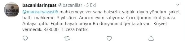 M.B yapı araçlarının belediyenin garajında olduğunu, ceza yazmak için bahane ürettiklerini söyledi. Sorunu çözmesi için M.B eski genel müdüre gitti. Genel müdür yardımcı olmadı. Başkan Mansur Yavaş’tan randevu istedi ancak randevu verilmedi. M.B olayı mahkemeye taşımak istiyor harç parası yok. İşçilere maaş ödeyemeyen M.B bankadan kredi çekip işçilerin maaşlarını öyle ödedi. Cezayı ise evini satıp ödeyecek. Twitter’dan sesini duyurmaya çalışan M.B’ye kimse dönüş yapmadı.