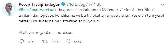 #BarışPınarıHarekatı’nda görev alan kahraman Mehmetçiklerimizin her birini alınlarından öpüyor, kendilerine ve bu harekatta Türkiye’yle birlikte olan tüm yerel destek unusurlarına muvaffakiyetler diliyorum. Allah yar ve yardımcımız olsun.”