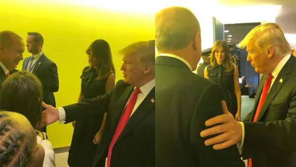 El sıkıştıktan sonra bir süre sohbet eden Cumhurbaşkanı Erdoğan’a eşi Emine Erdoğan, Trump’a da eşi Melania Trump’ın eşlik etti.