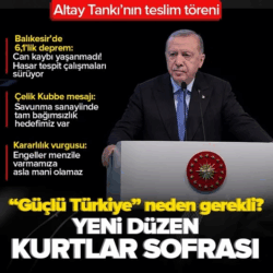 Altay Tanklarının Türk Silahlı Kuvvetlerine teslimatı için yapılan törende konuşan Başkan Erdoğan, yeni bir jeopolitik denklemin kurulduğuna dikkat çekerek, “Ürettiğimiz sistemlerle destan yazmaya devam ediyoruz. Takip eden değil, takip edilen bir ülke durumuna geldik. Her hamlesi her ürünü merakla beklenen bir ülkeyiz” ifadelerini kullandı..