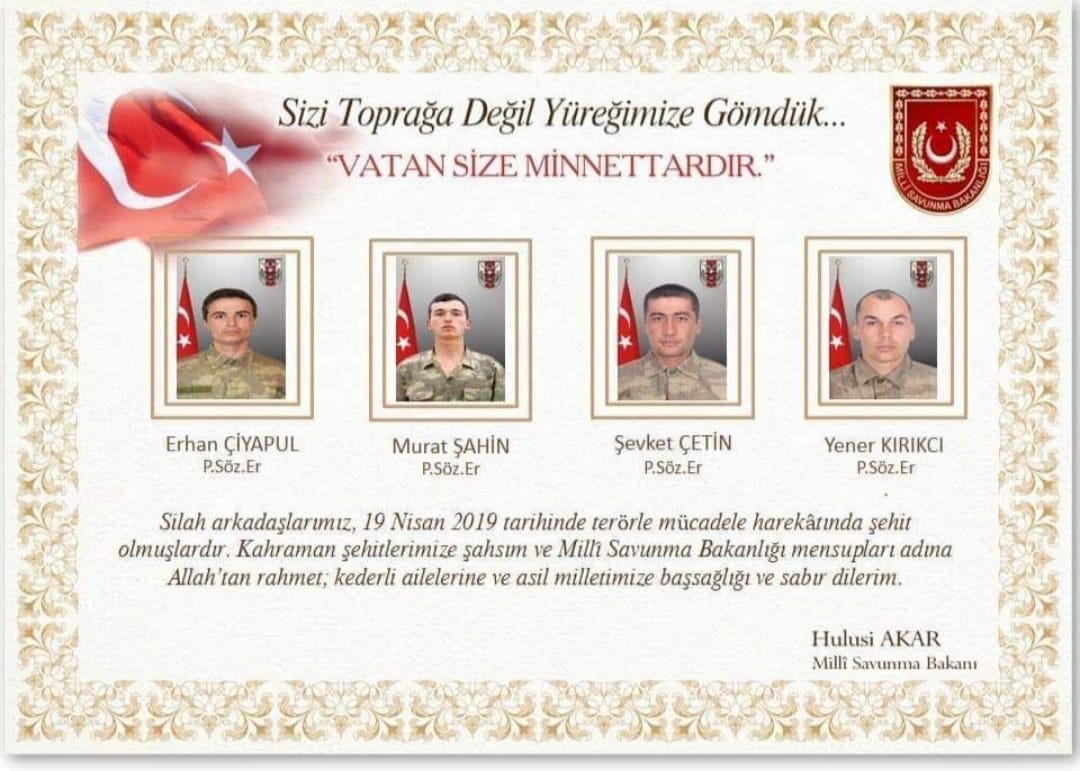 Yapılan açıklamada, “Şehit arkadaşlarımız 19 Nisan 2019 tarihinde terörle mücadele harekatında şehit olmuşlardır. Milli Savunma Bakanlığı mensupları adına Allah’tan rahmet diliyoruz” dendi.