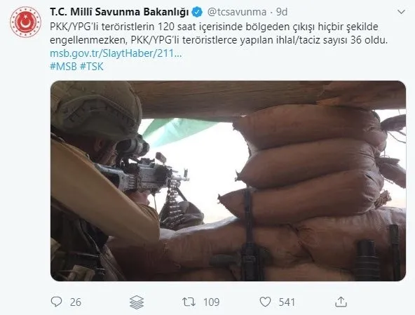 Amerika ile perşembe akşamı varılan ve 13 maddeden oluşan mutabakatın dolmasına 35 saatten az bir süre kala Milli Savunma Bakanlığı, son durumu paylaştı. Bakanlık, “ABD ile yapılan mutabakata rağmen PKK/YPG’li teröristlerce 17 Ekim 2019 saat 22.00’den itibaren toplam 36 taciz/ihlal gerçekleştirilmiştir.” açıklaması yaptı.