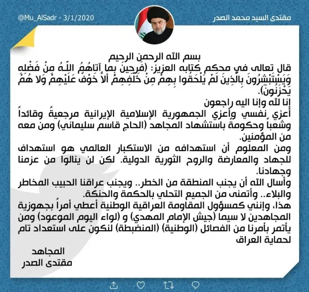 Süleymani’nin ölümünün ardından son dakika bir açıklama yayımlayan Iraklı Şii lider Mukteda es-Sadr, 2008 yılında bizzat kendisi tarafından lağvedilen “Mehdi Ordusu”nun tekrar aktif ettiğini duyurdu.