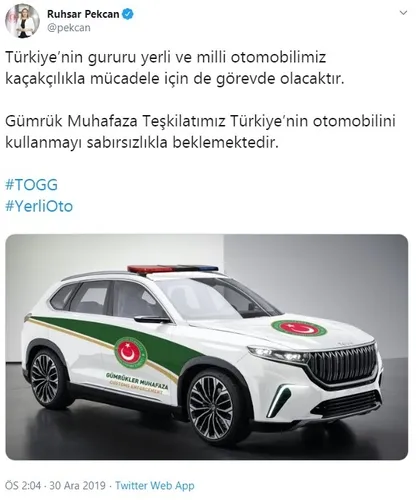 Pekcan yaptığı açıklamada, “Türkiye’nin gururu yerli ve milli otomobilimiz kaçakçılıkla mücadele için de görevde olacaktır. Gümrük Muhafaza Teşkilatımız Türkiye’nin otomobilini kullanmayı sabırsızlıkla beklemektedir.” ifadelerine yer verdi.